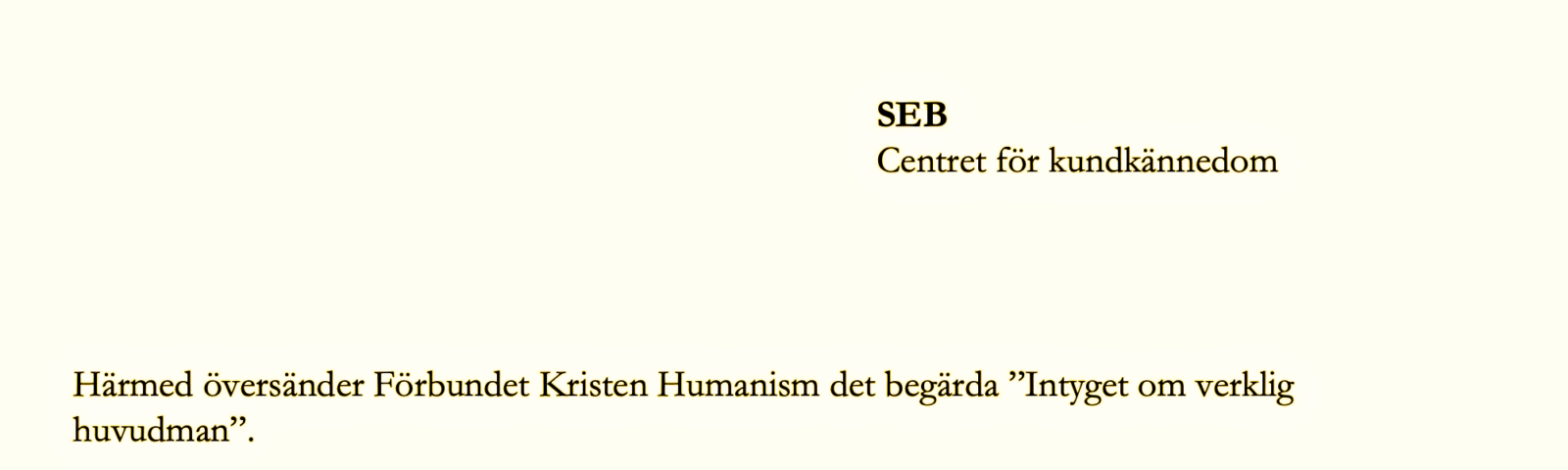 ”Exempelvis kunde SEB sluta förmedla pengar till och från off-shorebanker” 20 november 2019 av avKristen humanism Förbundets kassör har reagerat på SEBs begäran om intyg av ”verklig huvudman”. Läs och roas av förbundets svarsbrev. Brev